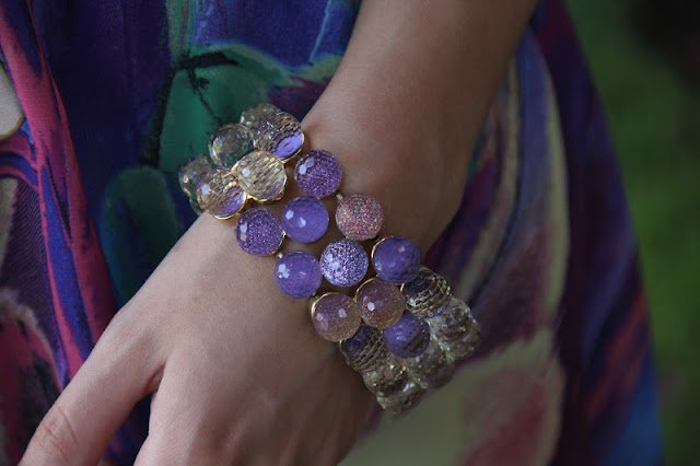 Despite the fact that September is already here, the hot weather doesn't want to leave. It's been so hot outside that I had to forget about all the fall clothes that I was so excited to wear soon, and go for something really light. That day I chose a bright flowy feather-print dress with a high-low hem and a matching golden belt. The cut and print of the dress are bold on their own, so I didn't see a need in dressing it up. The only accessory I wore was a statement bracelet with some pink, purple, and golden hues, to match the dress. I also wore a pair of nude heels so that they wouldn't overload the look.